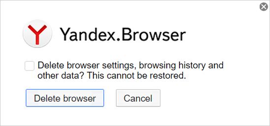 Your information and settings will only be deleted from your local computer. If you synced your devices, most of your profile data will be saved on the Yandex server. After you reinstall Yandex Browser and sync it with the server, your personal data and Yandex Browser settings will be restored. If you don't want your data to be restored, delete it from the server.