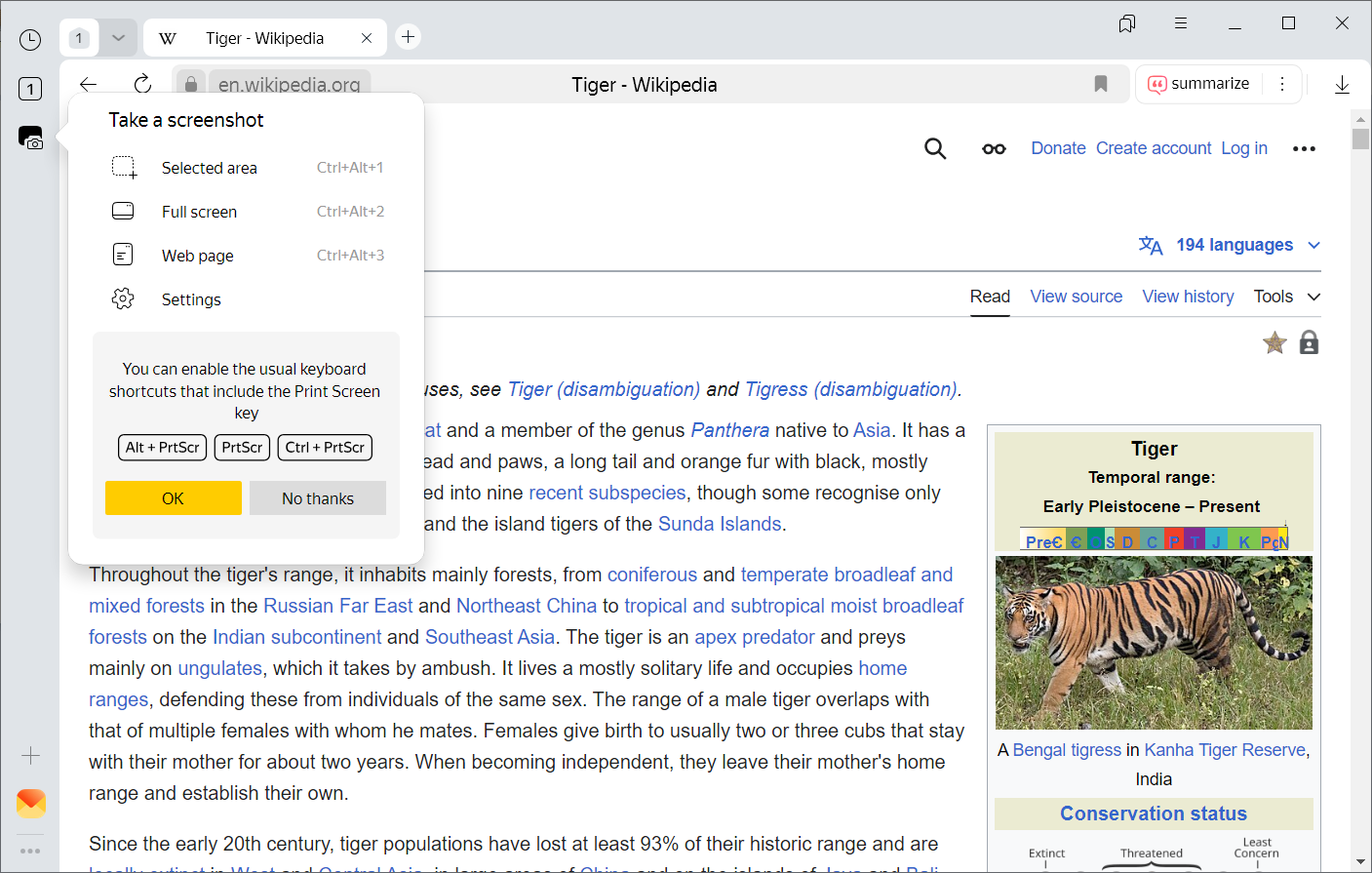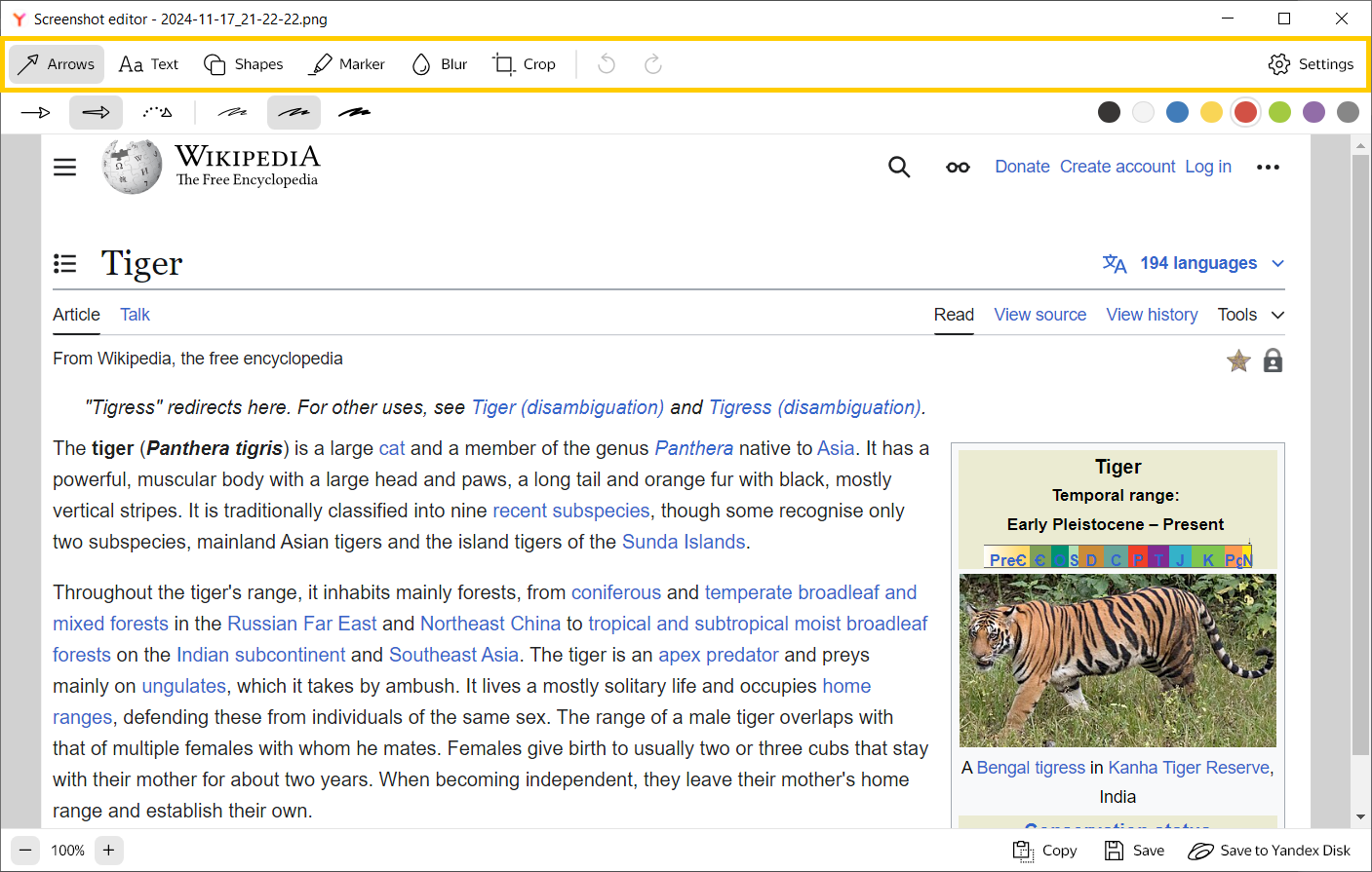 In Yandex Browser, you can take screenshots of the entire screen, the selected area, or the entire web page, edit the image, and add arrows and text to it. You can send a screenshot to your friends or to support.
