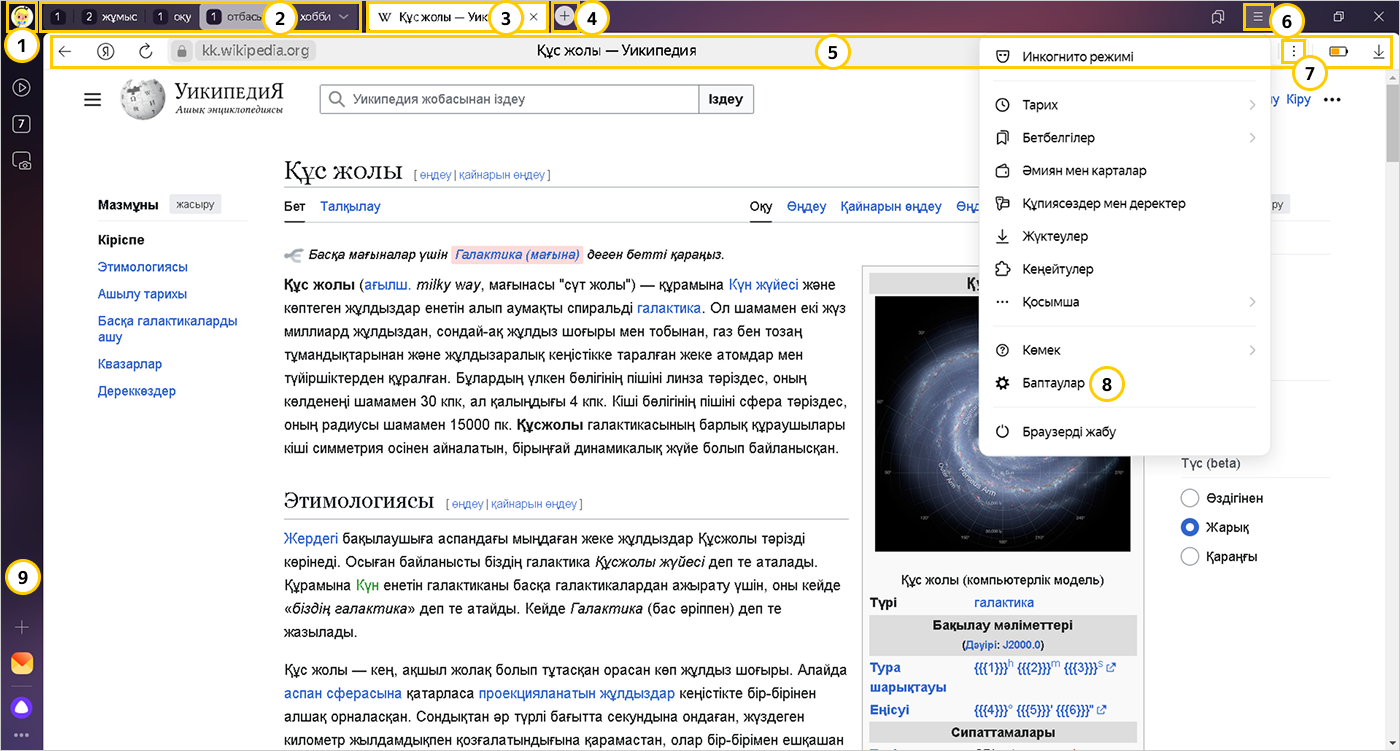Браузер интерфейсі көптеген элементтерді қамтиды. Оларды Браузерді өз қажеттіліктеріңізге қарай баптау арқылы қосуға және өшіруге болады.