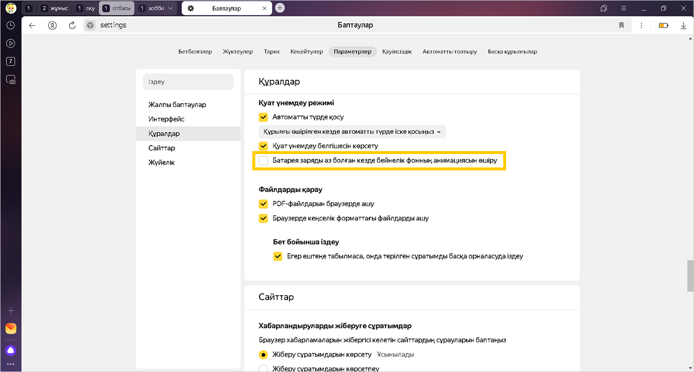 Жаңа қойындыдағы сілтемелердің мәтіндері мен батырмалардың атаулары оңай оқылуы үшін компьютерден жүктелген барлық фондарға қараңғылату фильтрі қолданылады. Бұл фильтрді алып тастау мүмкін емес. Егер сіз одан жарықтау фон алғыңыз келсе, бастапқы суреттің жарықтығын арттырыңыз.