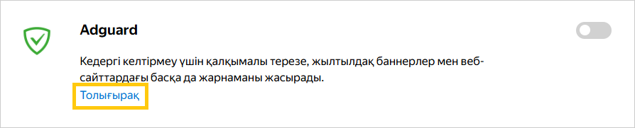 Тізімде алдын ала орнатылған кеңейтімдер (мысалы, Антишок) және Браузердің қосымша функциялары аталған (мысалы, синхрондау).