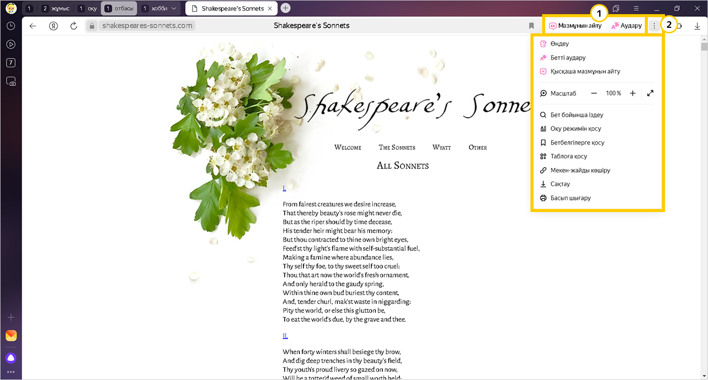 Ақылды жолдағы белгішесінің сол жағында сіз бет мәзірінде таңдаған әрекет түймелері пайда болады. Мысалы, қайта айту, аудару немесе оқу режимін қосу.