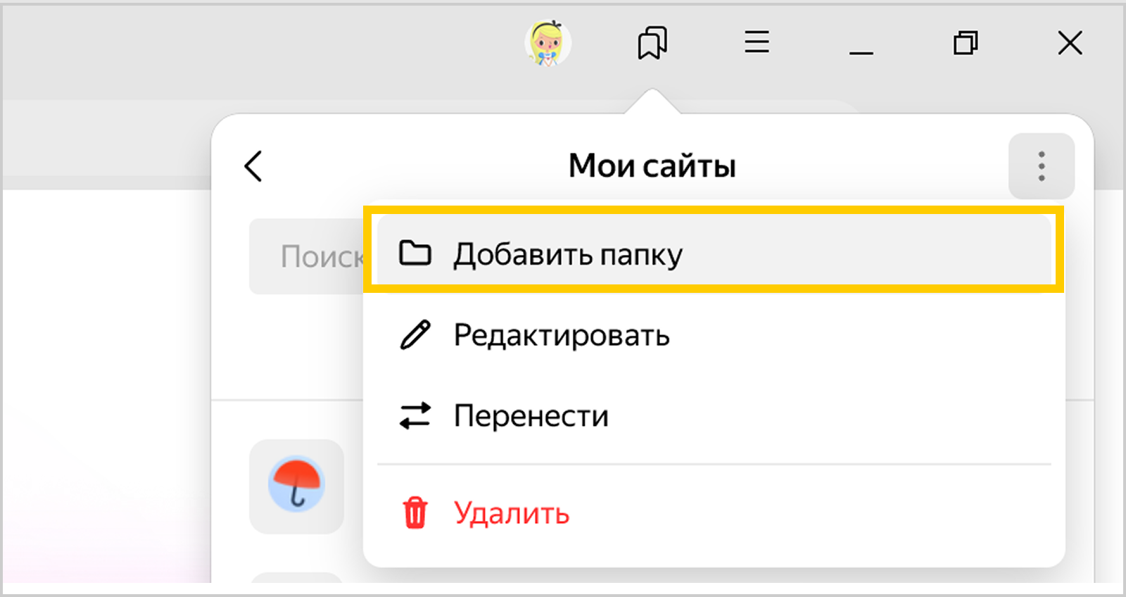 Справа от Закладки нажмите Меню → Добавить папку.