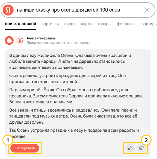 Чтобы Алиса сгенерировала текст, в поиске Яндекса напишите запрос. Укажите в запросе вводные данные для Алисы, например: что нужно написать, объем, стиль, детали, контекст.