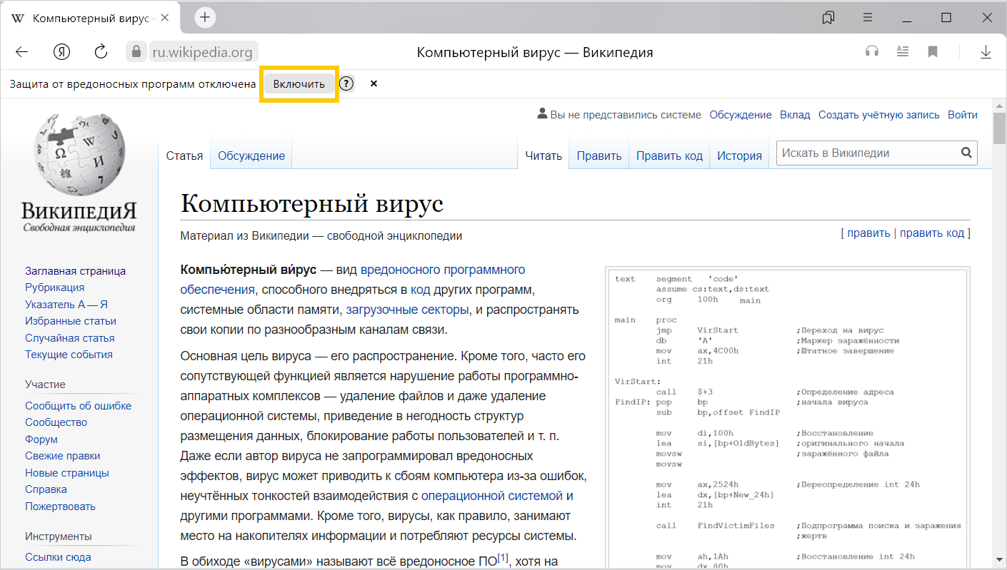 Поэтому, если защита от вредоносного ПО была отключена, Браузер предупреждает об этом и предлагает ее включить: