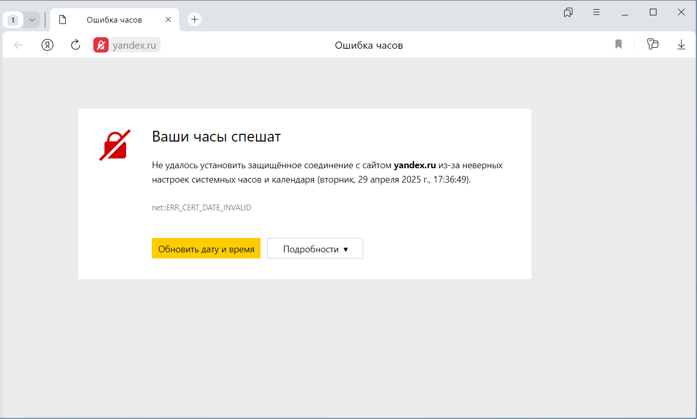 Если на вашем компьютере неверно установлено время, Браузер не сможет определить, актуальный сертификат у сайта или нет. Поэтому при открытии сайта вы увидите сообщение «Ваши часы спешат» или «Ваши часы отстают».