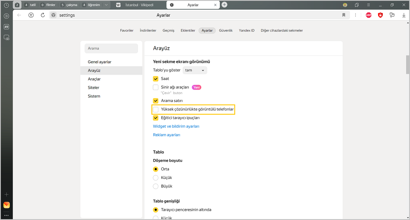 Animasyonlar varsayılan olarak yüksek çözünürlükte oynatılır. Bu, Yandex Browser'ın çalışmasını yavaşlatıyorsa, animasyon kalitesini standart olarak ayarlayın: