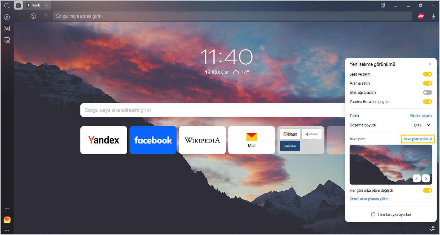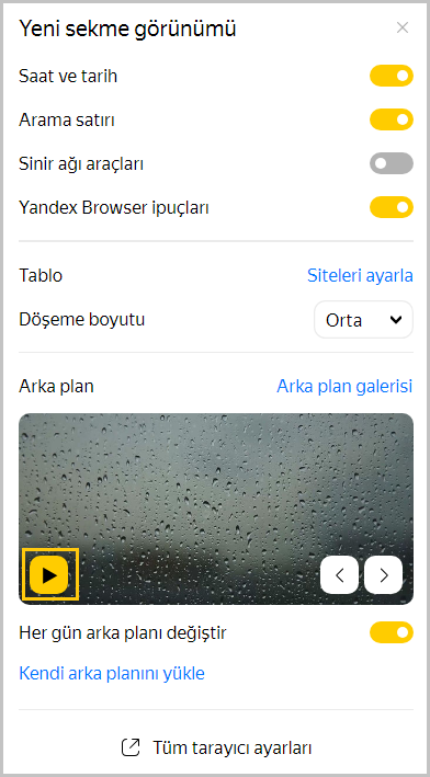 Yeni sekmede bağlantı metinlerinin ve buton adlarının kolayca okunabilmesi için bilgisayardan yüklenen tüm arka planlara karartma filtresi uygulanır. Bu filtre devre dışı bırakılamaz. Arka planın daha açık renklerde olmasını istiyorsanız yüklediğiniz görselin parlaklığını arttırın.