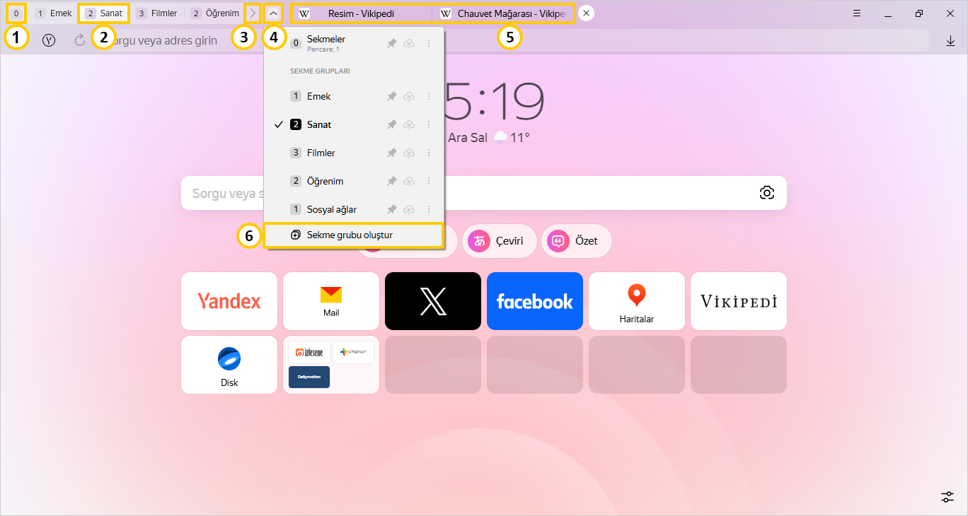 Yandex Browser'da sekme gruplarını istediğiniz pencerede açabilirsiniz. Bunu yapmak için