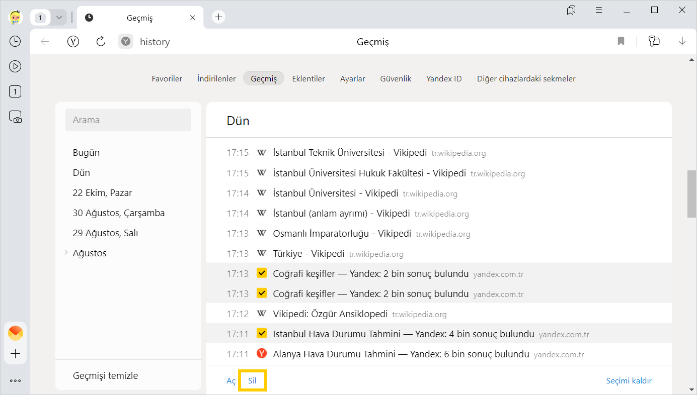 → Geçmiş → Tüm geçmiş ögesine tıklayın veya Ctrl + H tuşlarına basın.