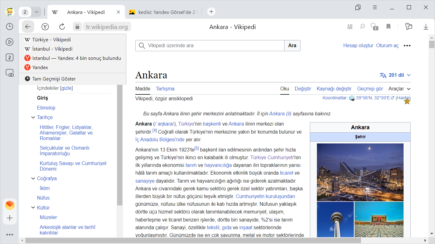 Sekme geçmişi, açılmış son 12 sayfayı içerir. Bu listede aradığınız sayfayı bulamıyorsanız tüm geçmişe gidin. Geçmişinizde, son 90 gün içerisinde ziyaret ettiğiniz siteler saklanır. Bundan daha önce ziyaret ettiğiniz bir siteyi bulmanız gerekiyorssa, ilgili siteyi Favorilere ekleyin.