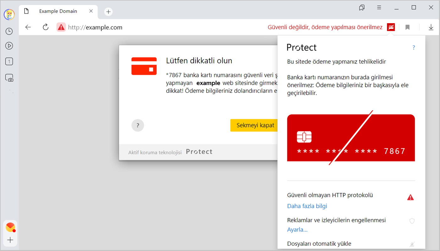 Banka kartı numarasını **** güvenli veri şifrelemesi kullanmayan example.com sitesinde girmek üzeresiniz. Ödeme bilgileriniz internet dolandırıcılarının eline geçebilir. |