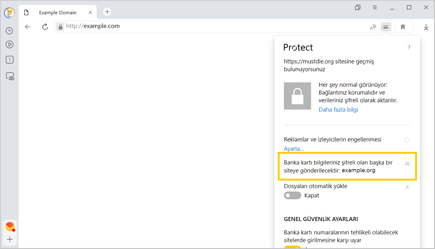 Banka kartı bilgileriniz korumalı example.com sitesine gönderilecektir. |