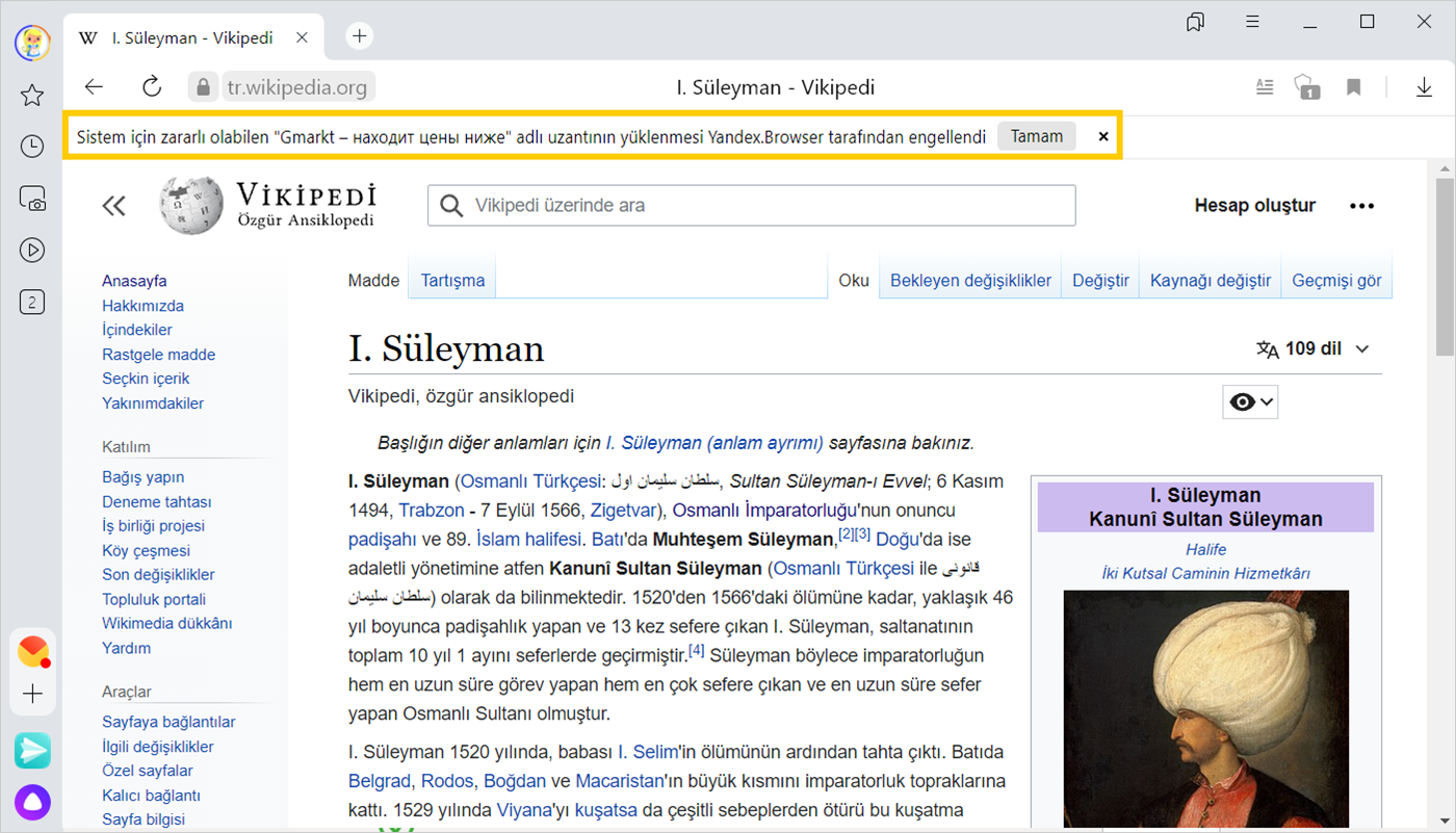 Bir eklentiyi kurmadan önce, Yandex Browser özel bir veritabanında saklanan kötü amaçlı eklenti listesine başvurarak eklentinin güvenliğini kontrol eder. Eklenti o listede varsa Yandex Browser ilgili eklentinin kurulumunu engeller ve durum hakkında bir uyarı mesajı gösterir: