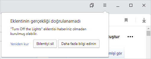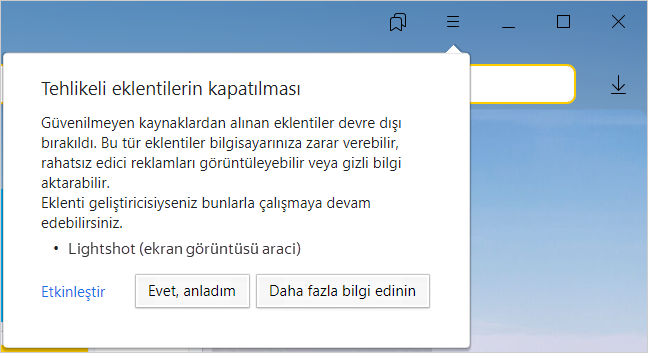 Uzantıyı ancak kaynağına tam olarak güvendiğiniz durumlarda etkinleştirin. Eklenti kötü amaçlı olabilir. Tarayıcı, kötü amaçlı eklentileri engeller. Öte yandan, kötü amaçlı olup da henüz kara listeye alınmamış olan eklenti verilerinizi tehlikeye atabilir. Daha ayrıntılı bilgi için Kötü amaçlı eklentilerin zararı nedir? bölümüne bakın.