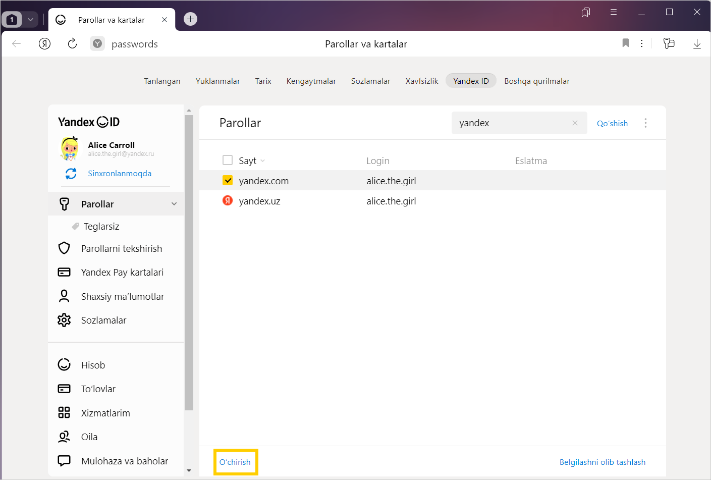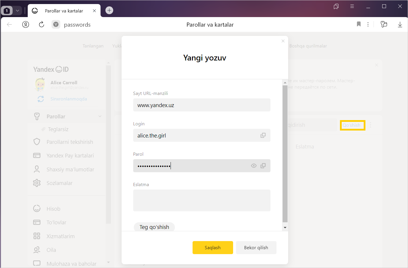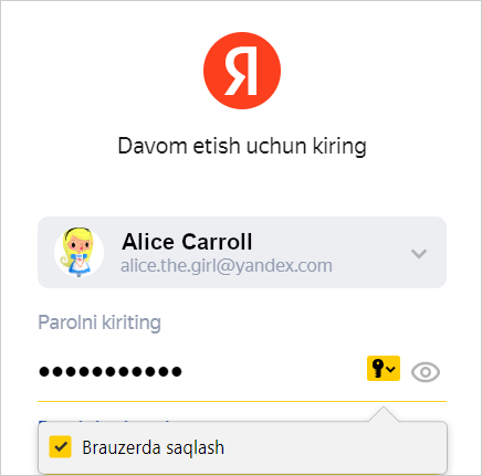 Xavfsizlik uchun parollar serverda shifrlangan shaklda saqlanadi. Shuning uchun hatto Yandex ham parollaringizni shifrdan chiqara olmaydi.